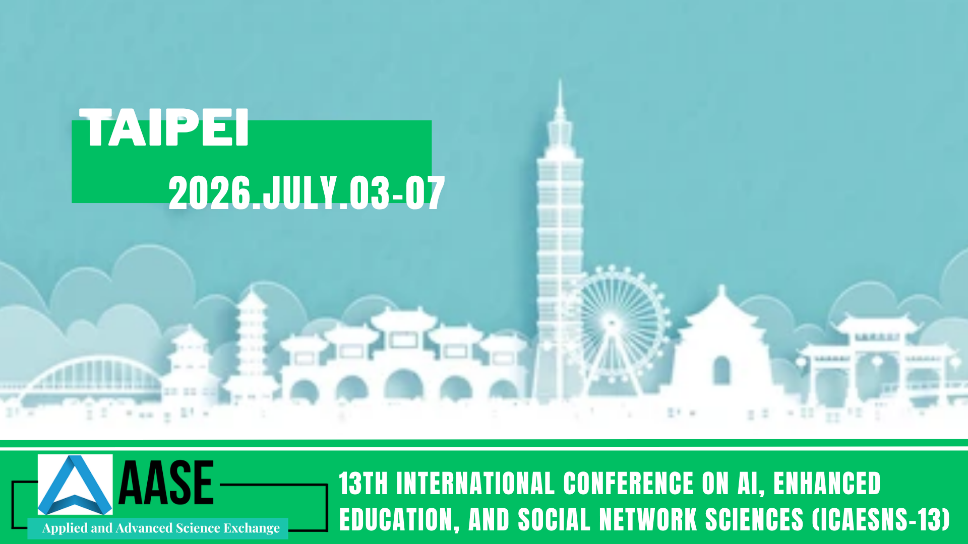 We warmly welcome scholars, researchers, and professionals worldwide to join the International Conference on AI, Enhanced Education, and Social Network Sciences (ICAESNS-13), held from July 3 to 7, 2026, in Taipei. This global academic event gathers thought leaders and interdisciplinary researchers to exchange knowledge, explore emerging trends, and tackle challenges across AI, education, and social sciences.